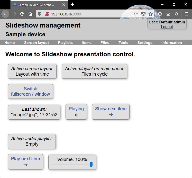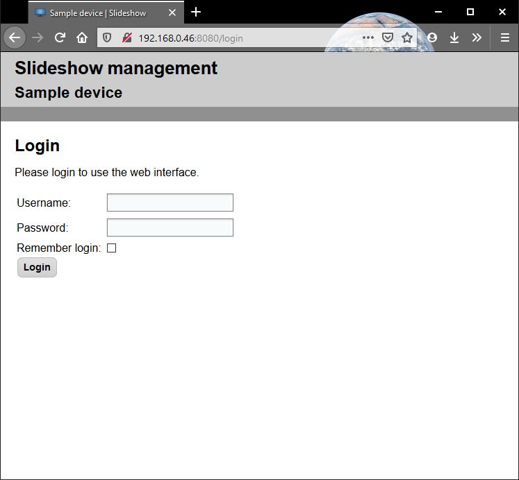 If the Android devices, on which Slideshow is running, is connected to the local network, you can manage the app from you computer, phone or tablet. Note that the interfaces mentioned bellow work only from the same local network (LAN). If you want to manage Slideshow remotely, you can setup file synchronization from your HTTP/FTP server, Google Drive or Dropbox.