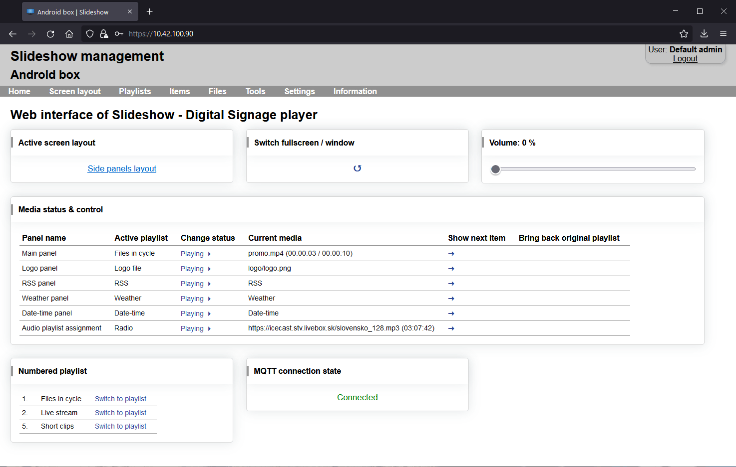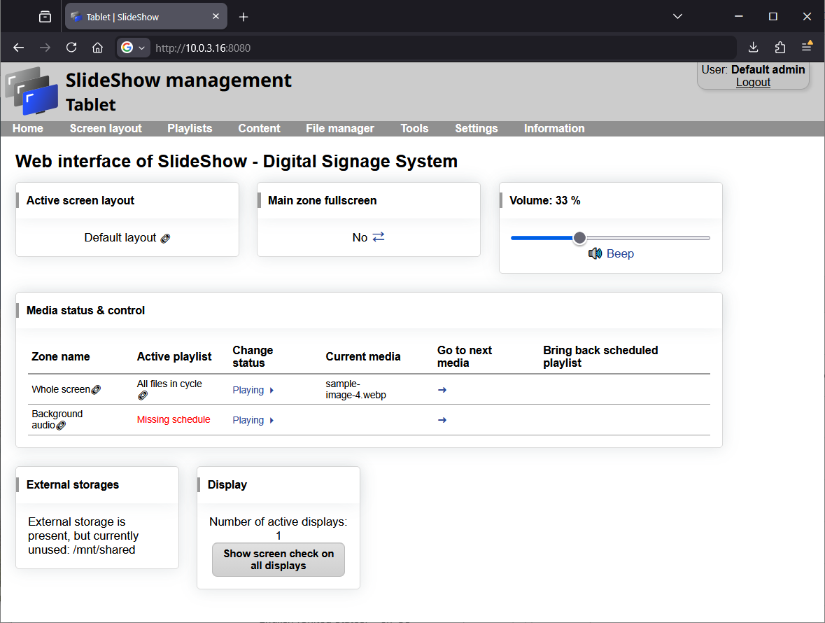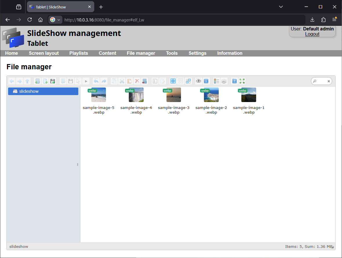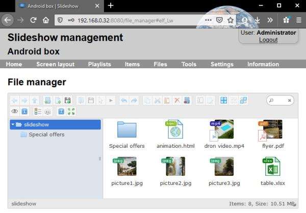 7. You can upload new files through the web interface → menu File Manager. Add files which you would like to play through Slideshow using drag and drop them from your computer to the File manager.