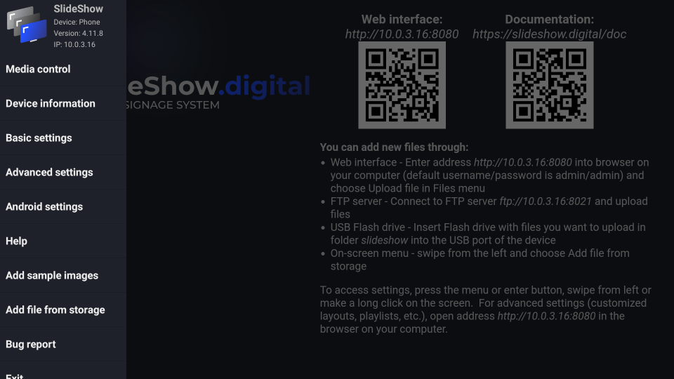 6. If your Android device is connected to the local network (through Wi-Fi or Ethernet cable), you can access Slideshow's web interface through browser on your computer. Just enter the URL address of the web interface displayed on the screen (above the first QR code) to the browser on your computer. If Slideshow is already displaying some other files, you can reopen the screen with URL address through the on-screen menu → Help, or using keyboard shortcut h or Space.