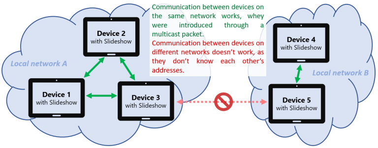 In order for two devices with Slideshow app to communicate with each other, they first have to discover each other, so they know where (to which IP address and network port) they should send messages. Slideshow automatically sends out an introduction message as a multicast packet, which is delivered to all devices on the same local network (unless it is blocked by router or Wi-Fi). Another device running Slideshow receives this multicast packet, checks if it was sent by a device with the same group code, and if yes, they establish a direct communication channel. This method with multicast packets is similar to Bonjour and SSDP protocols.