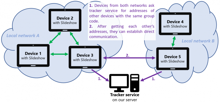In order to solve this, we are hosting a small service on our public servers called tracker. It receives addresses and hashed group codes from individual devices with Slideshow, and if the tracker finds that two or more devices have the same group code, it lets them know each other's addresses. The devices can then establish direct communication using those addresses and they pass the data without using the tracker as a middle man. Thanks to this, the tracker service can be really tiny and requires few resources on the server, so we can offer it without asking for any kind of payment.