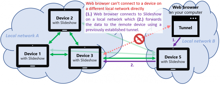 If the devices are on different networks, we also enabled a special feature called Tunnel web interface. It creates a network tunnel between the two devices, using which a web browser on your computer can access the web interface of Slideshow installed on the remote device. This tunnel uses UDP protocol (as required for the Hole punching method mentioned above), and its transfer speed is usually much lower than the regular network speed. As Slideshow's web interface is quite lightweight, the tunnel is still fast enough to provide access to all management features.