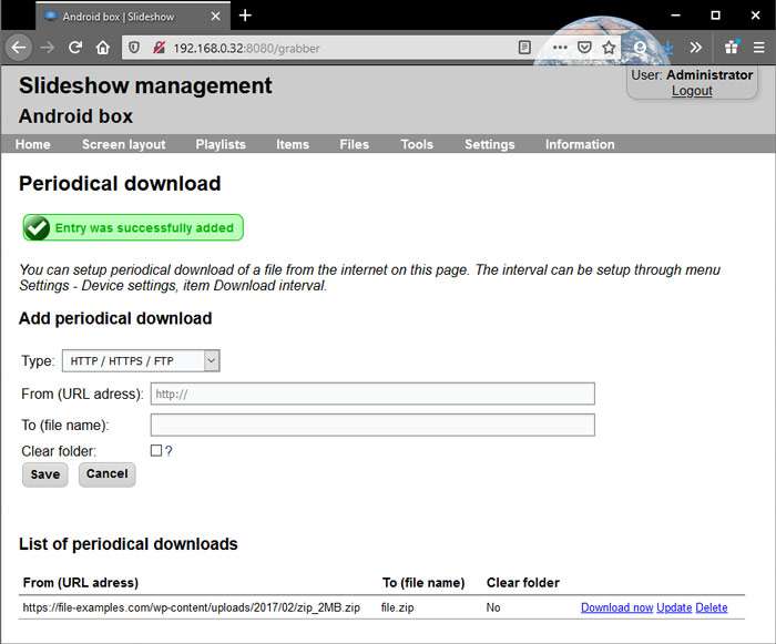 One of the ways to manage files on Slideshow remotely, even if you are hundreds or thousands kilometers away from the device, is file synchronization using ZIP file from HTTP or FTP server.