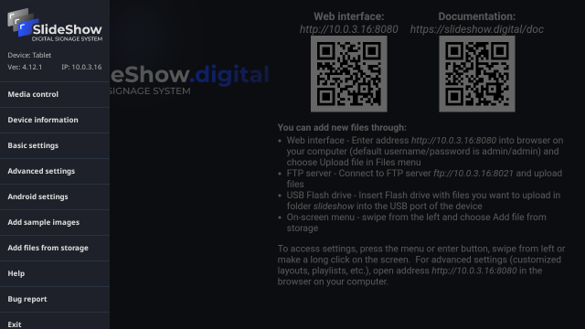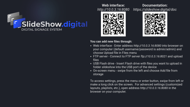 6. If your Android device is connected to the local network (through Wi-Fi or Ethernet cable), you can access Slideshow's web interface through browser on your computer. Just enter the URL address of the web interface displayed on the screen (above the first QR code) to the browser on your computer. If Slideshow is already displaying some other files, you can reopen the screen with URL address through the on-screen menu → Help, or using keyboard shortcut h or Space.