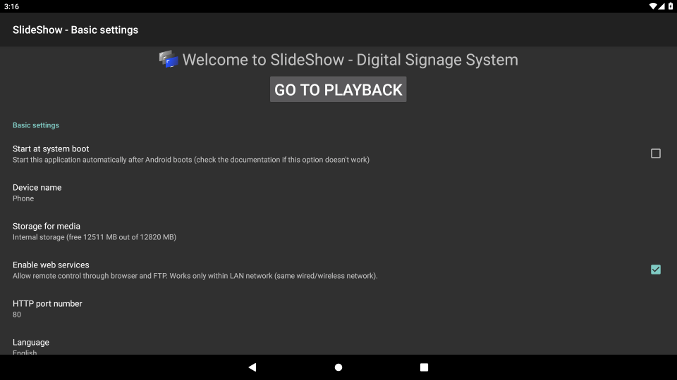 3. After granting the necessary permissions you will get the following screen with basic settings. Review them, adjust if needed and press the Go to playback button.
